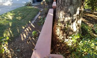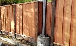 Backing is the term used for placing pressure treated wood horizontally against the redwood boards. Backing is used when there is higher soil in certain areas, a planter bed, or greenery that may cause the redwood boards to become damaged. Adding backing to a fence will help with the longevity. A Retaining Wall is used when your neighbor or city property is at a different grade than your home. If your home is higher, the retaining wall will be set on the other side of the fence. This prevents any soil from sliding; it will help retain the soil/dirt on its belonging side. Typically a retaining wall is needed when the grading difference is more than 12"; anything shorter will only need a taller kickboard (a 2x12 Kickboard vs the standard 2x8 Kickboard).