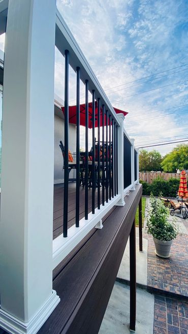 Deck, Stairs, & Balusters in Saddle with white Posts